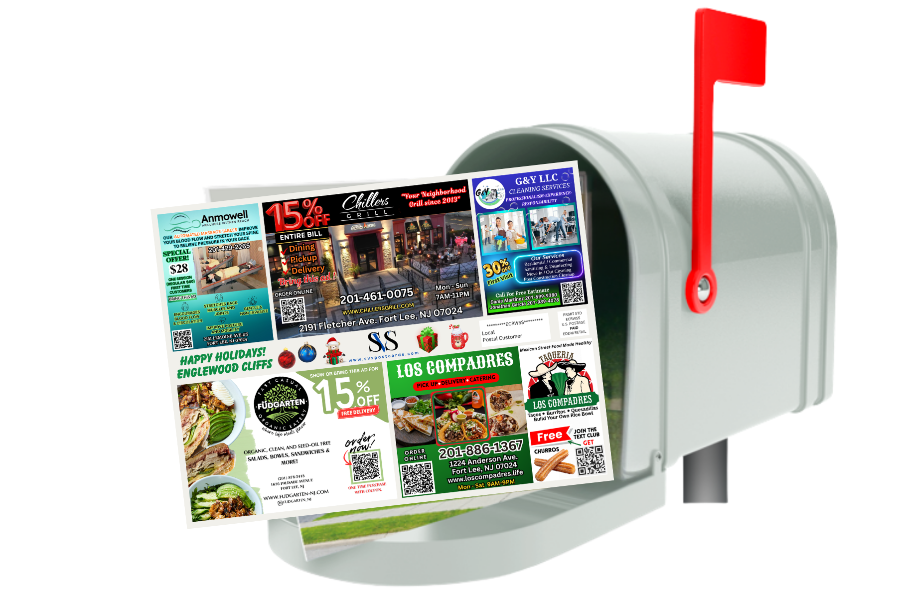 Every business gets a front-page ad on our postcard, ensuring immediate visibility. Delivered directly to mailboxes, your message gets unrivaled attention, ensuring it’s seen.